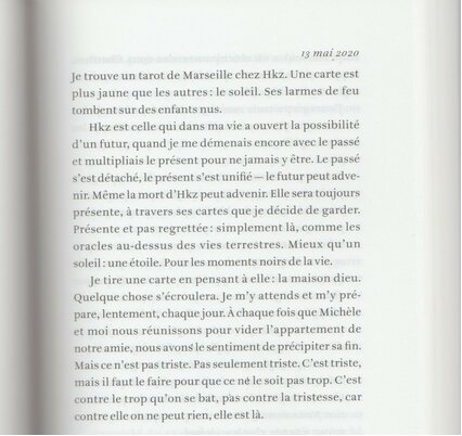 C’est en évoquant la séparation du vivant de son amie qui se sépare du monde d’abord, puis d’elle-même, mais pas non plus complètement (l’âme jusqu’au bout ou les traces de cette âme merveilleuse quand la raison déraille, raison du livre) qu’il touche sur ce qu’est l’amitié (son cœur même). L’auteur nous entraîne au fin fond d’un service de gériatrie, au fin fond d’un Ehpad sans que ce soit ni angoissant ni oppressant. C’est là qu’il sonde l’amitié, pas quand c’était beau à la terrasse du Select ou lors d’une représentation théâtrale, mais quand son amie pénètre une zone grise.