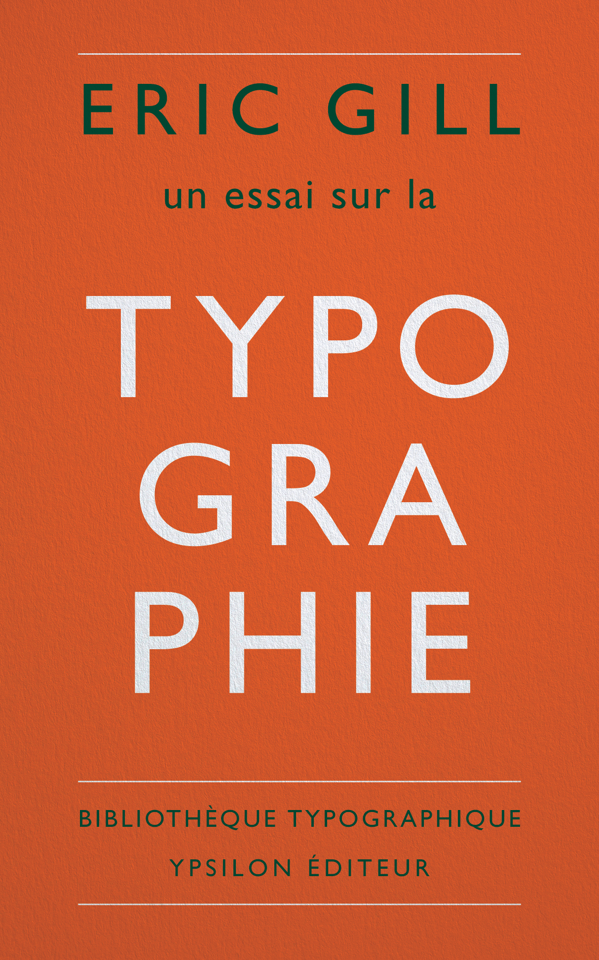 An Essay on Typography, publié en 1931 puis en 1936 dans une seconde édition révisée et augmentée, est son ouvrage le plus connu. Gill y décrit et commente les méthodes de création et de production typographiques de son époque, des formes des lettres à la composition textuelle. Mais ce livre est également une réflexion sur l’état des relations entre le travail manuel de l’homme, sa dimension créative & son remplacement croissant par la machine, ainsi que des contradictions inévitables qu’elles suscitent. Il paraît en langue française pour la première fois.